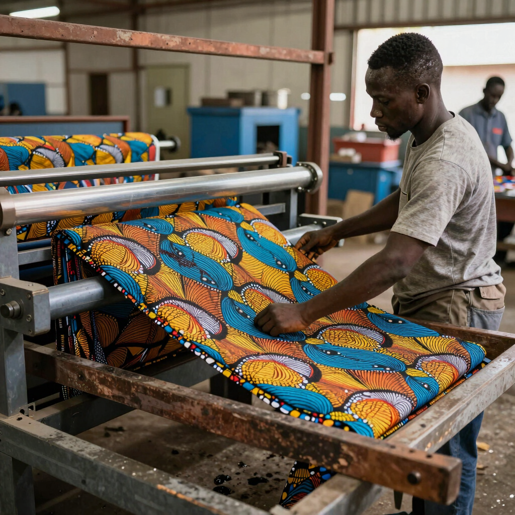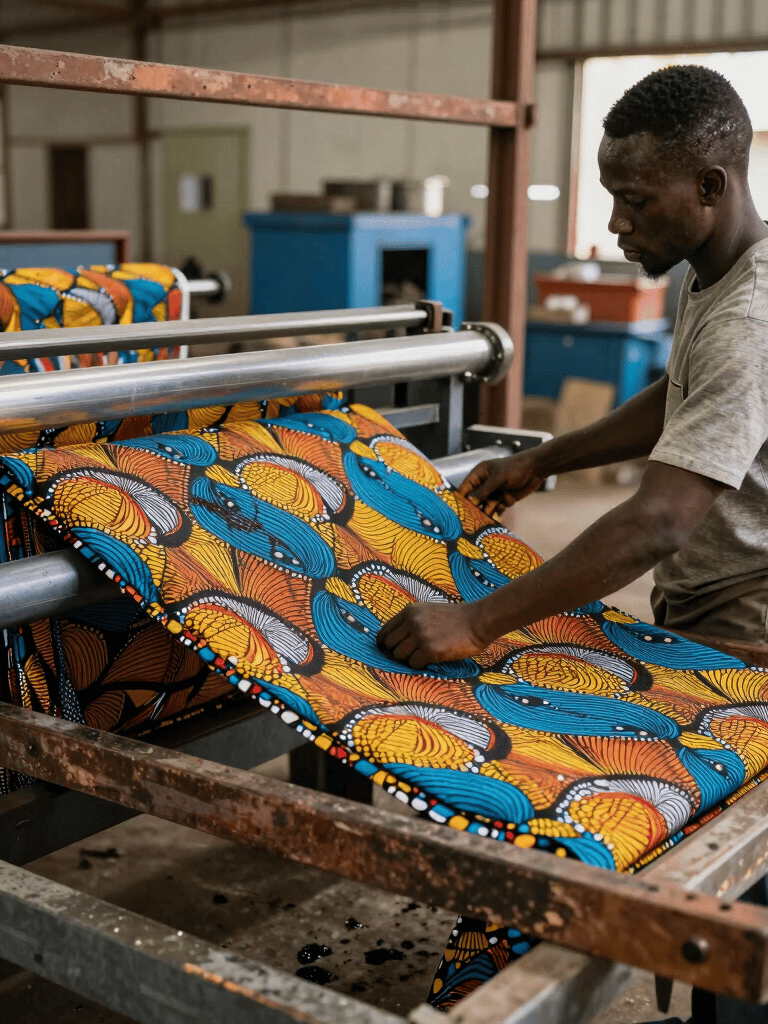 À l’origine, il s’inspire du batik, une technique venue de Indonésie, où l’on utilise de la cire pour créer des motifs sur le tissu. Au XIXe siècle, les Pays-Bas ont industrialisé cette technique et tenté de l’exporter en Asie… sans succès.