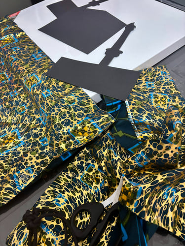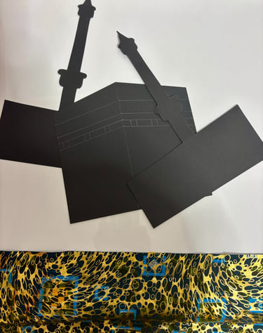 Cette œuvre a été faite en papier cartonné noir découpé à la main, habillée et embellie d'un tissu doré ornant la Kaaba tel un objet précieux.